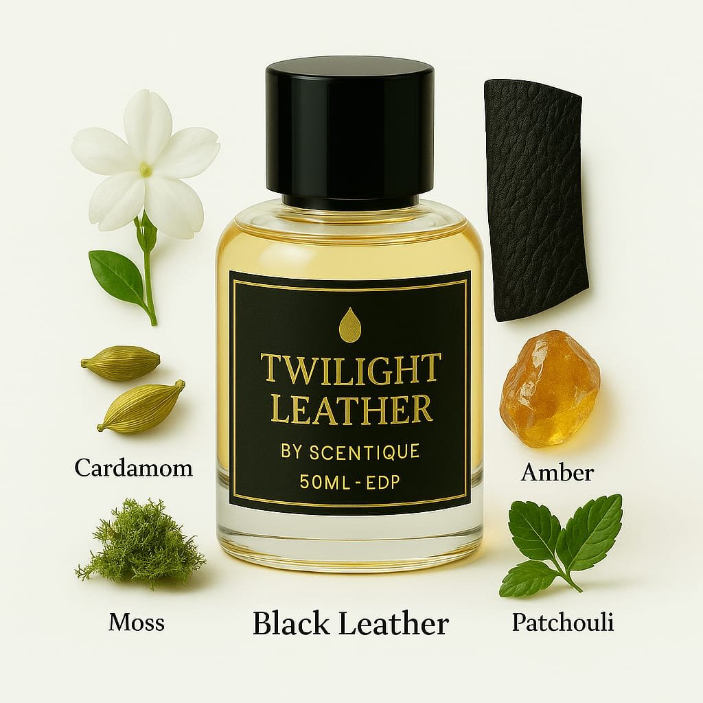 Smooth, sensual, and powerfully confident — Twilight Leather captures the allure of fine leather under a dusky sky. The fragrance opens with cardamom and jasmine sambac, melting into a rich heart of leather and patchouli, grounded by amber and moss for a deep, smoky warmth. Bold yet refined, it’s a statement scent for men who embrace strength with sophistication.